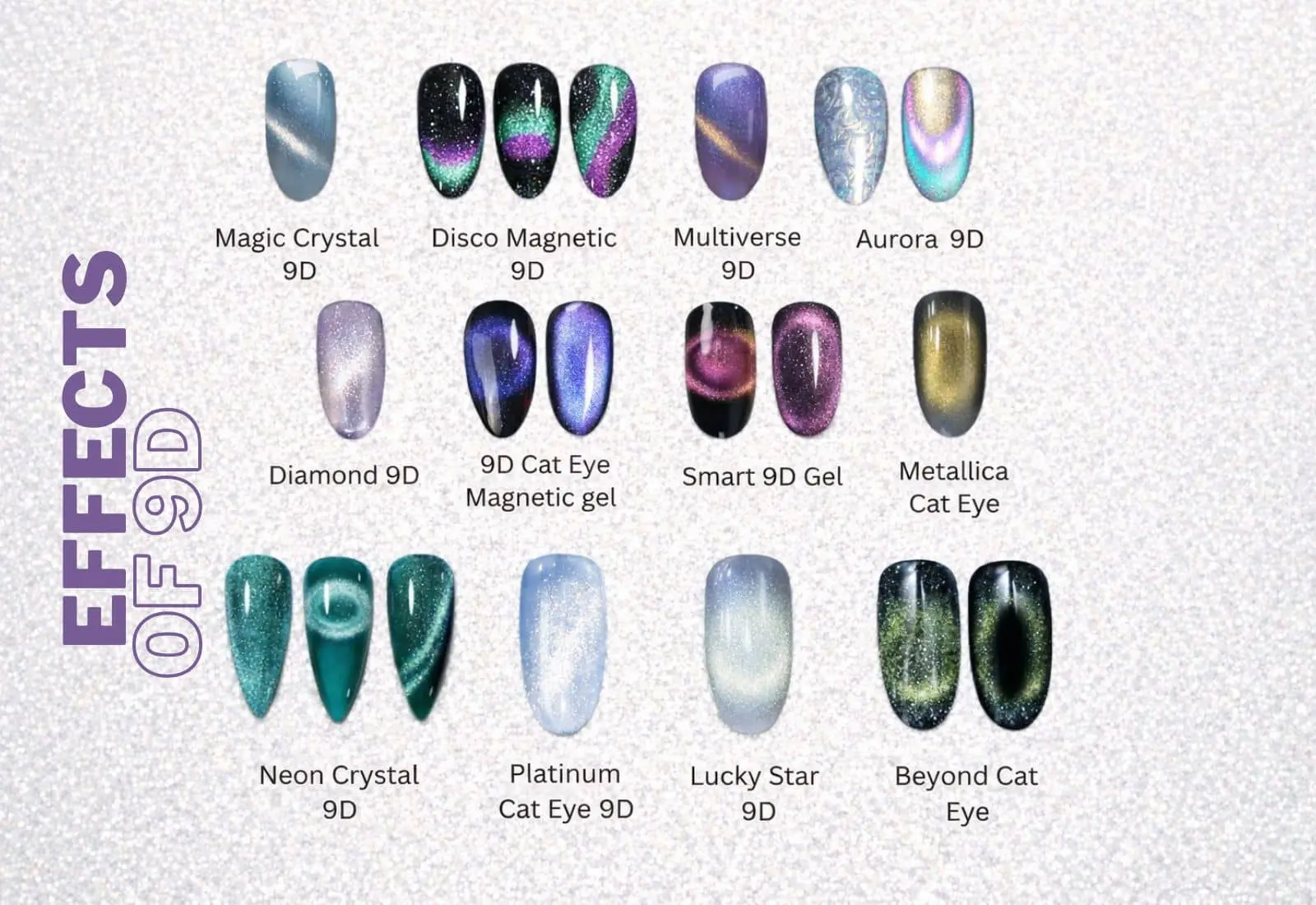 However, 9D effects benefit from using different magnet shapes (such as stick, round, or multi-pole magnets), which allow nail artists to create more complex angles, layered movement, and deeper light shifts.