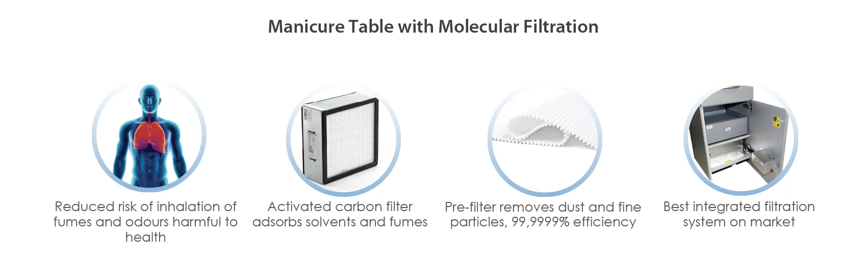 A Manicure Table is an essential piece of equipment for nail technicians. Providing them with a dedicated workspace to offer professional nail services. However, it’s crucial to prioritize the safety and well-being of both the technician and the client. That’s why our Salon manicure table goes above and beyond by incorporating an advanced active carbon filter system. Ensuring a cleaner and safer working environment. With a reduced risk of inhalation of fumes and odors harmful to health, our manicure table sets a new standard in integrated filtration systems.