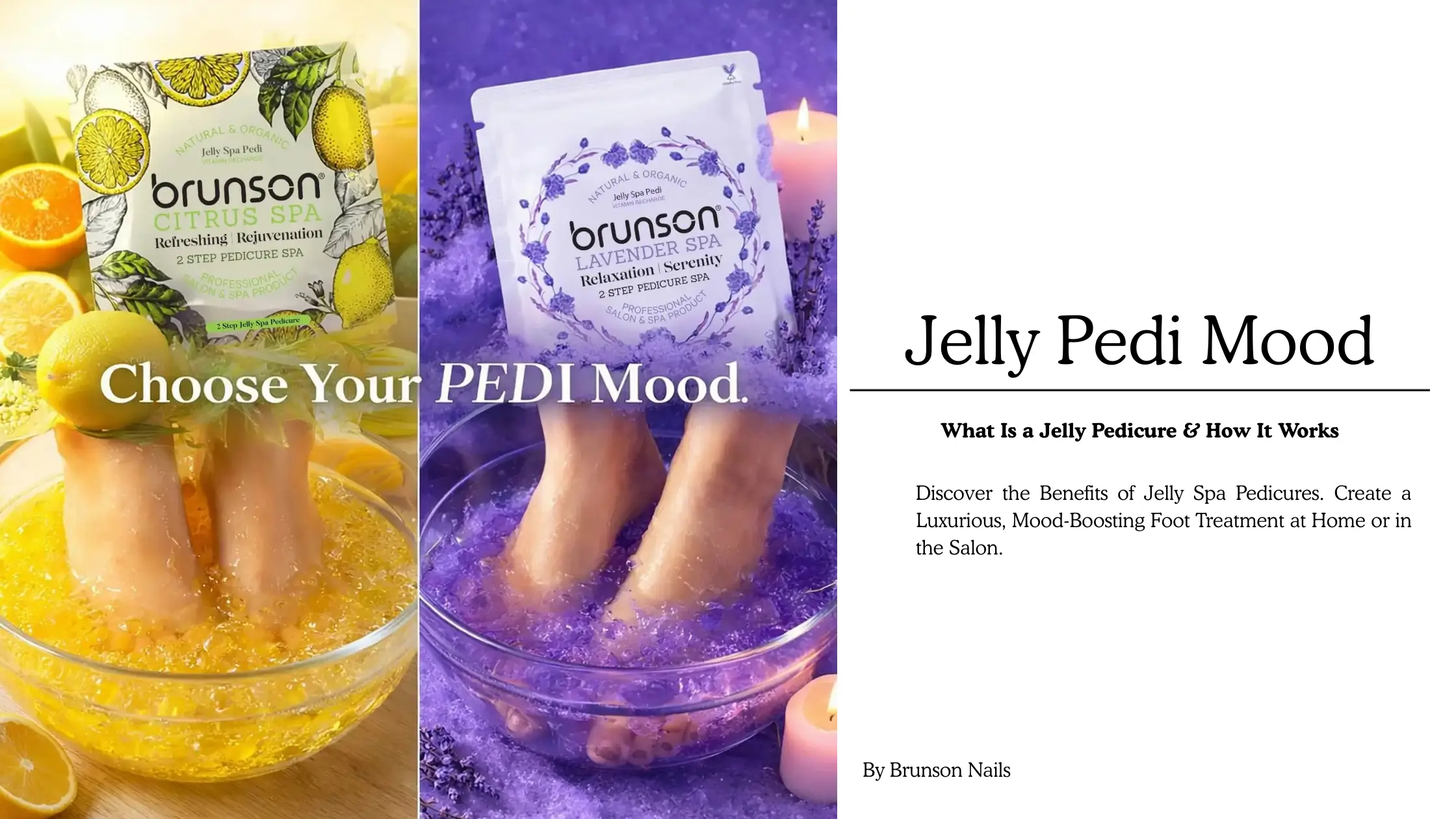 Looking for a spa-quality pedicure experience that’s both luxurious and easy to achieve at home? Enter the world of jelly pedicures – an innovative foot treatment that’s taking the beauty industry by storm. Brunson’s 2-Step Jelly Spa Kits available in Citrus and Lavender, offer a unique sensory experience that goes beyond traditional foot soaks. These kits transform water into a soothing, hydrating jelly that pampers your feet like never before.