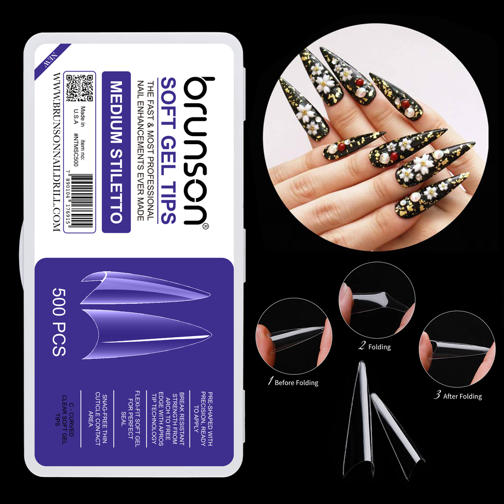 Brunson Soft Gel Nail Tips Medium Stiletto Full Coverage Clear Soft Gel Tips 500pcs 11 sizes BTMSF500