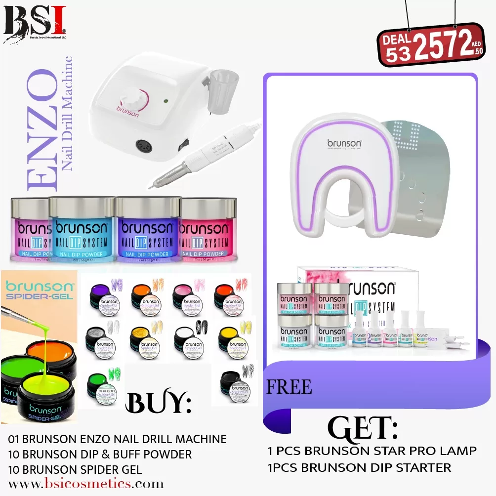 Deal 53- Buy Brunson Enzo Nail Drill Machine, 10 Dip Powder, 10 Spider Gel, and Get 1 Brunson Star Pro UV Lamp, Dip Starter Kit and Bag FREE!
