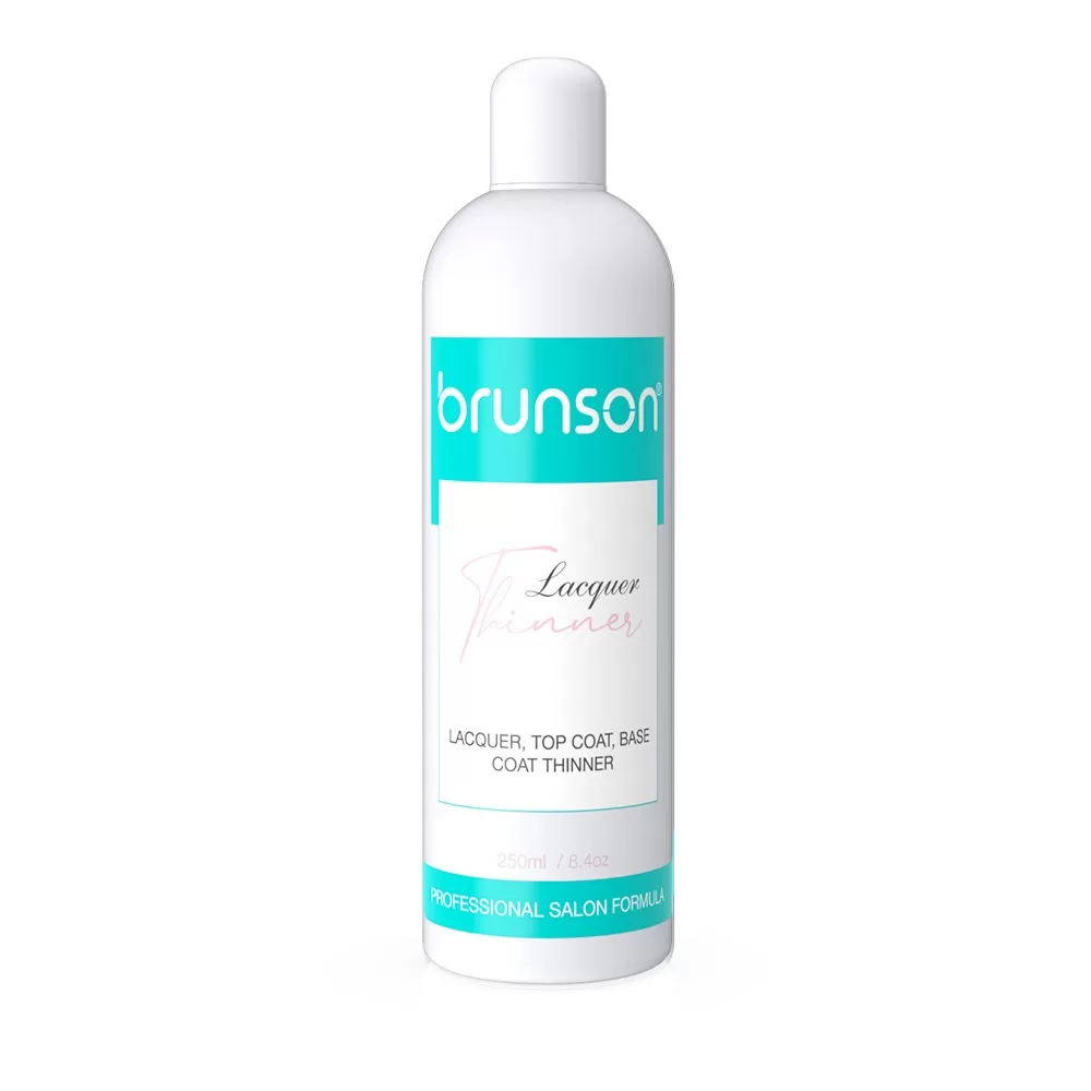 - Start by adding a small amount of Brunson Lacquer Thinner to your thickened nail polish, top coat, or base coat. Add a few drops at a time, stirring the product in between each addition.