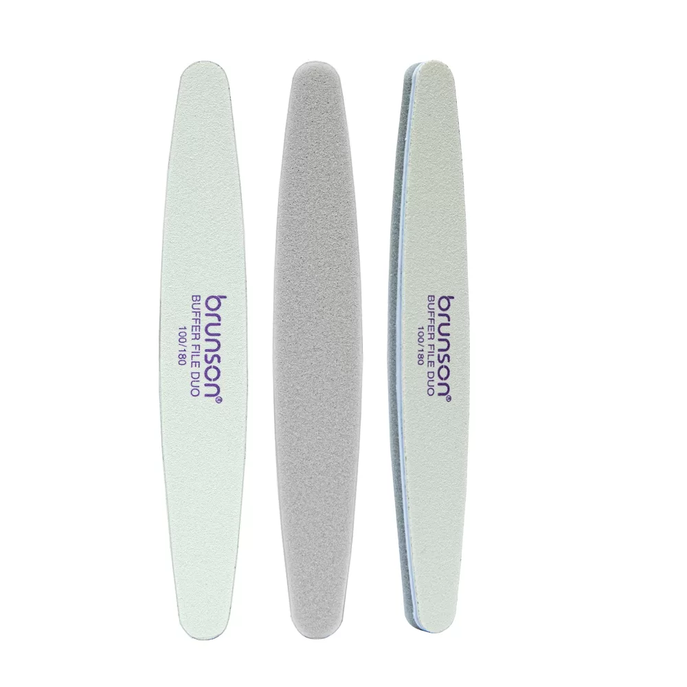 The Brunson Buffer File Duo 100/180 Grit is the best nail buffer file duo for all your nail care needs. This double-sided emery board nail file has two sides with different grits, 100 and 180, making it the perfect tool for shaping and smoothing both natural and artificial nails.