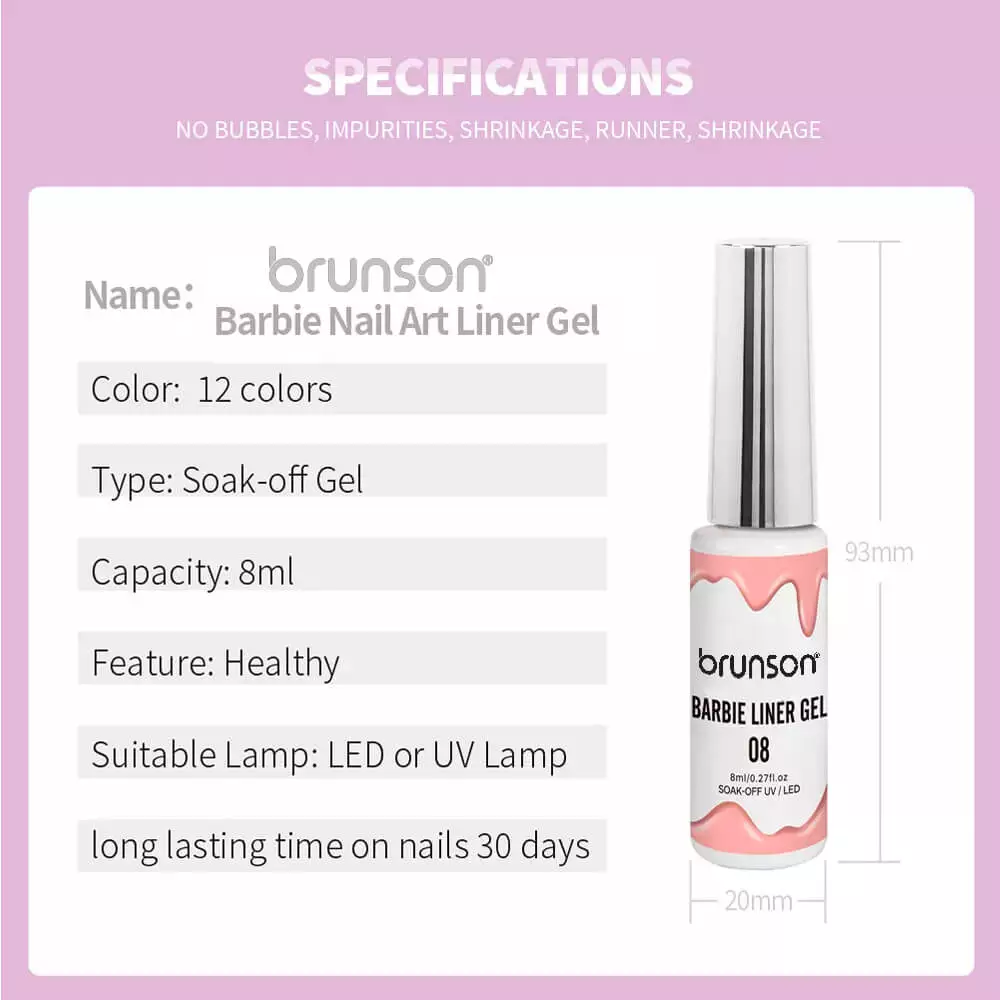 The Nail Art Set is a perfectly portable gel set that comes in 12 popular and trendy colors. Each bottle contains platinum liner gel with a capacity of 8ml /0.27fl oz, making it easy to take your nail game to the next level, no matter where you go. With a line nail brush attached to the cap of each bottle, you can make even the most intricate designs on your nails with ease.