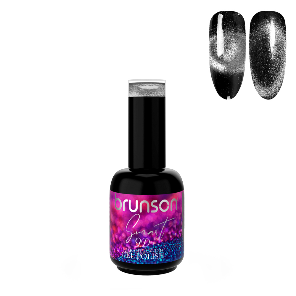 Brunson’s Smart 9D Cat Eye Magnetic Soak Off UV Gel Polish BSMC106 is creates a “cat eye” effect on the nails. It uses magnetic particles in the polish that are attracted to a magnet included with the polish. When the polish is applied, and the magnet moves close to the nail, it creates a swirling, 3D effect that resembles the eyes of a cat. This nail polish is usually applied as a top coat over regular nail polish and typically requires UV or LED light to cure. The final look is glossy and shimmery. The effect is temporary and last on nails until the polish is removed.