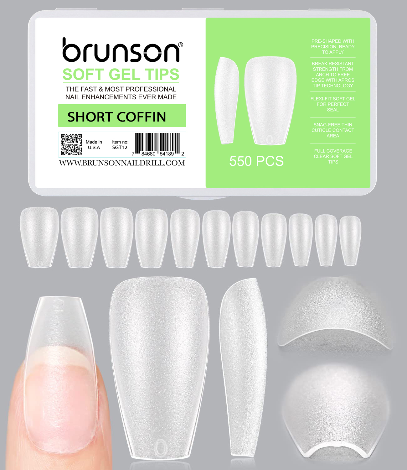 Brunson Soft Gel Nail Tips, Extra Long-Coffin C-Curved Soft Gel Tips is a Coffin Shape Extra Long nail tips. These are made with a soft gel material that is flexible and easy to work with, making them perfect for both professional salon use and at-home.