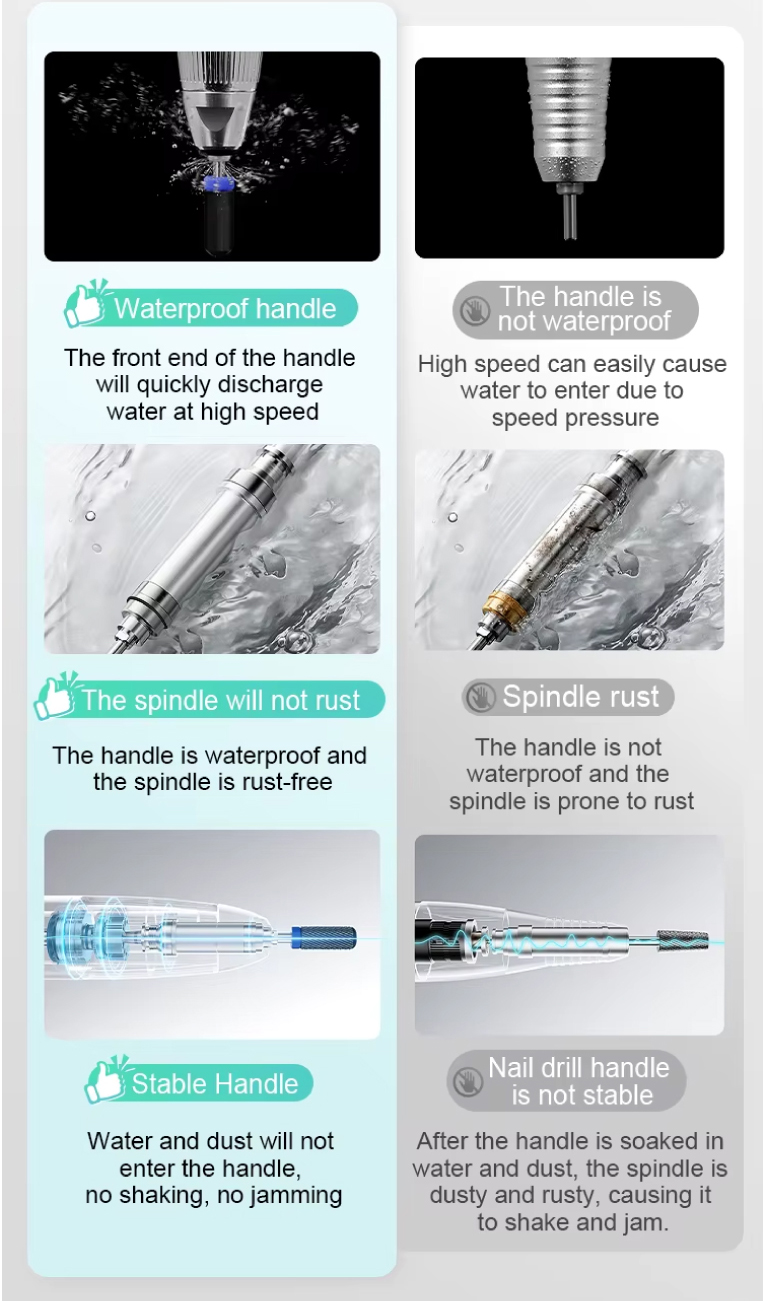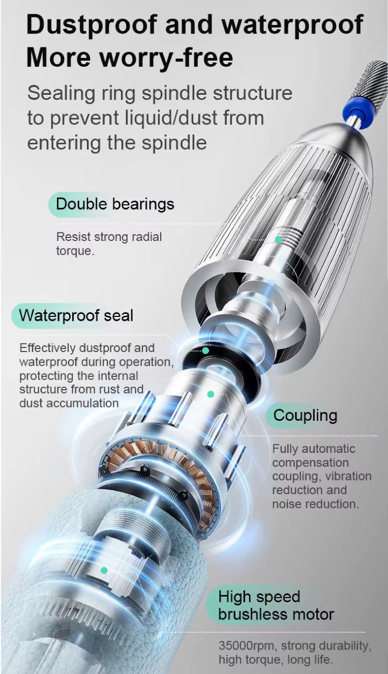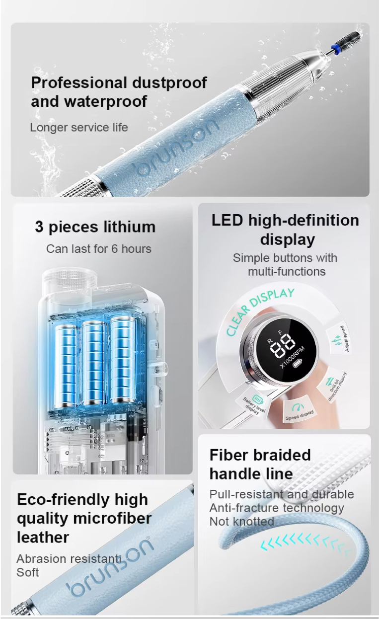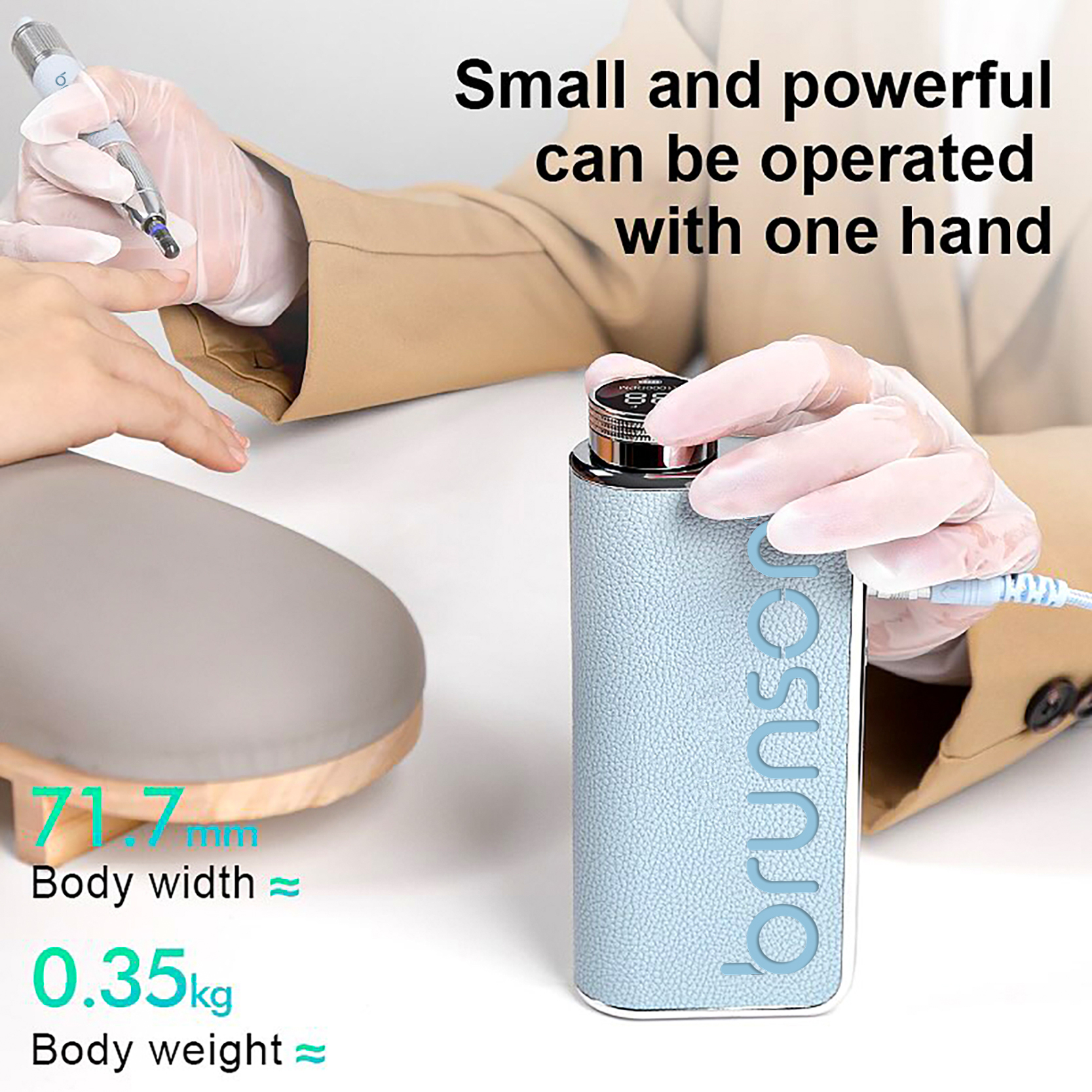 This is a portable, high-speed nail drill with an advanced brushless motor, built-in waterproof protection, and a compact form factor that fits comfortably in your hand or workstation. Powered by a long-lasting lithium battery, it delivers up to 6 hours of uninterrupted performance, making it ideal for busy salons or mobile nail services.