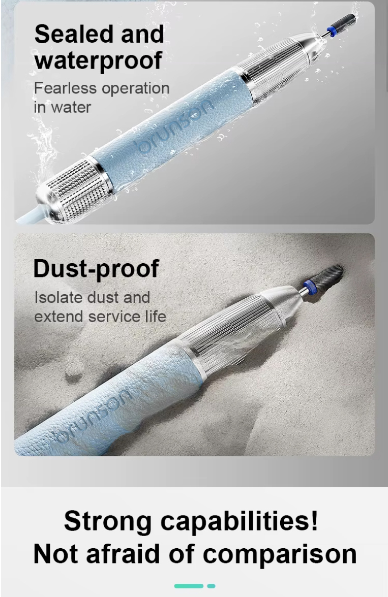 The Brunson Yacht Master brings all the essential features of a professional nail drill into a sleek, compact, and durable form. It’s built to handle high-speed work without overheating, jamming, or breaking down under pressure. The waterproof and dustproof handle design adds a layer of safety and longevity rarely found in machines at this level.