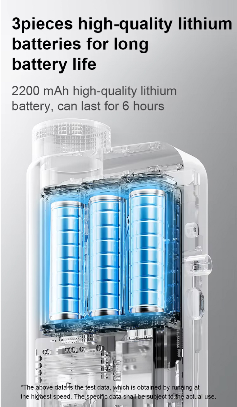 3 pieces of high-quality lithium batteries for extended battery life. A 2200 mAh high-quality lithium battery can last for 6 hours (*The above data is the test data, which is obtained by running at the highest speed. The specific data shall be subject to the actual use.)